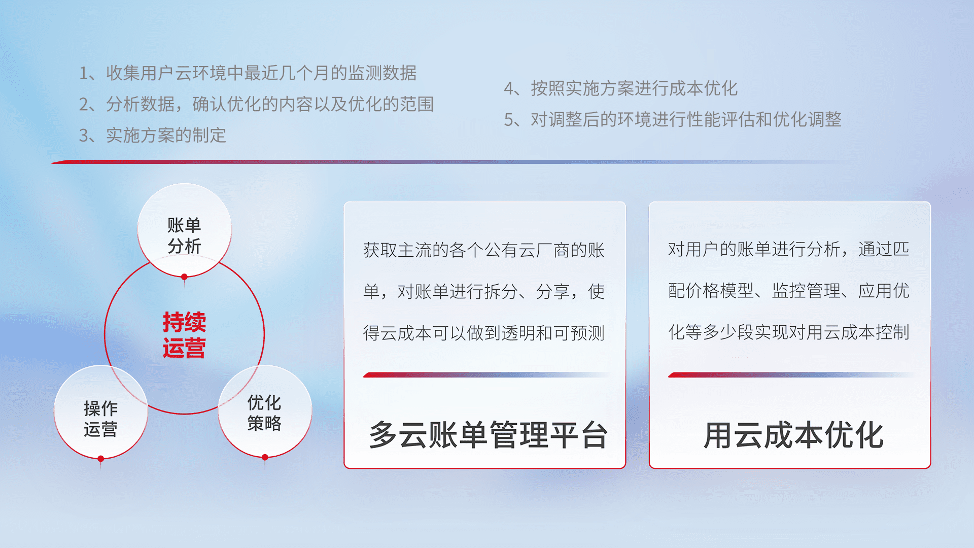 通过多云纳管,,以统一的资源数据模型把客户的云资源进行抽象和封装,,,,进而实现对多云资源的统一操作,,,保障云资源管理的可靠性、、稳定性与可用性。。。量身定制化运维内容,,配置、、、开发运维、、补丁管理、、、、备份、、监控、、、、认证和访问管理、、审计和日常巡检等,,,,保障在用云过程中的可靠度,,,,稳定度以及高可用率。。
